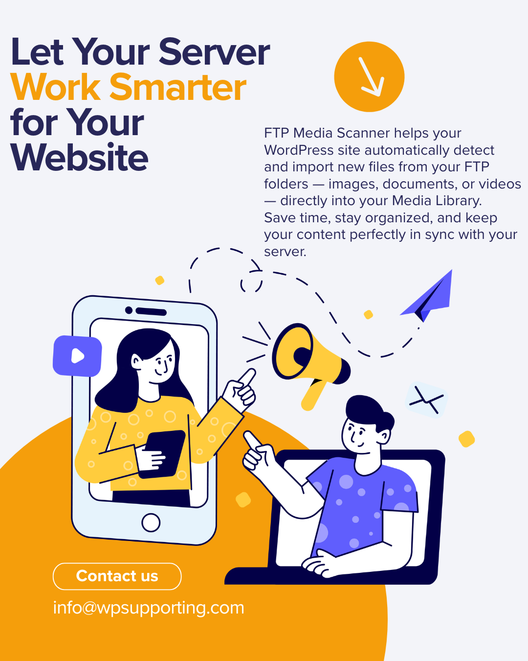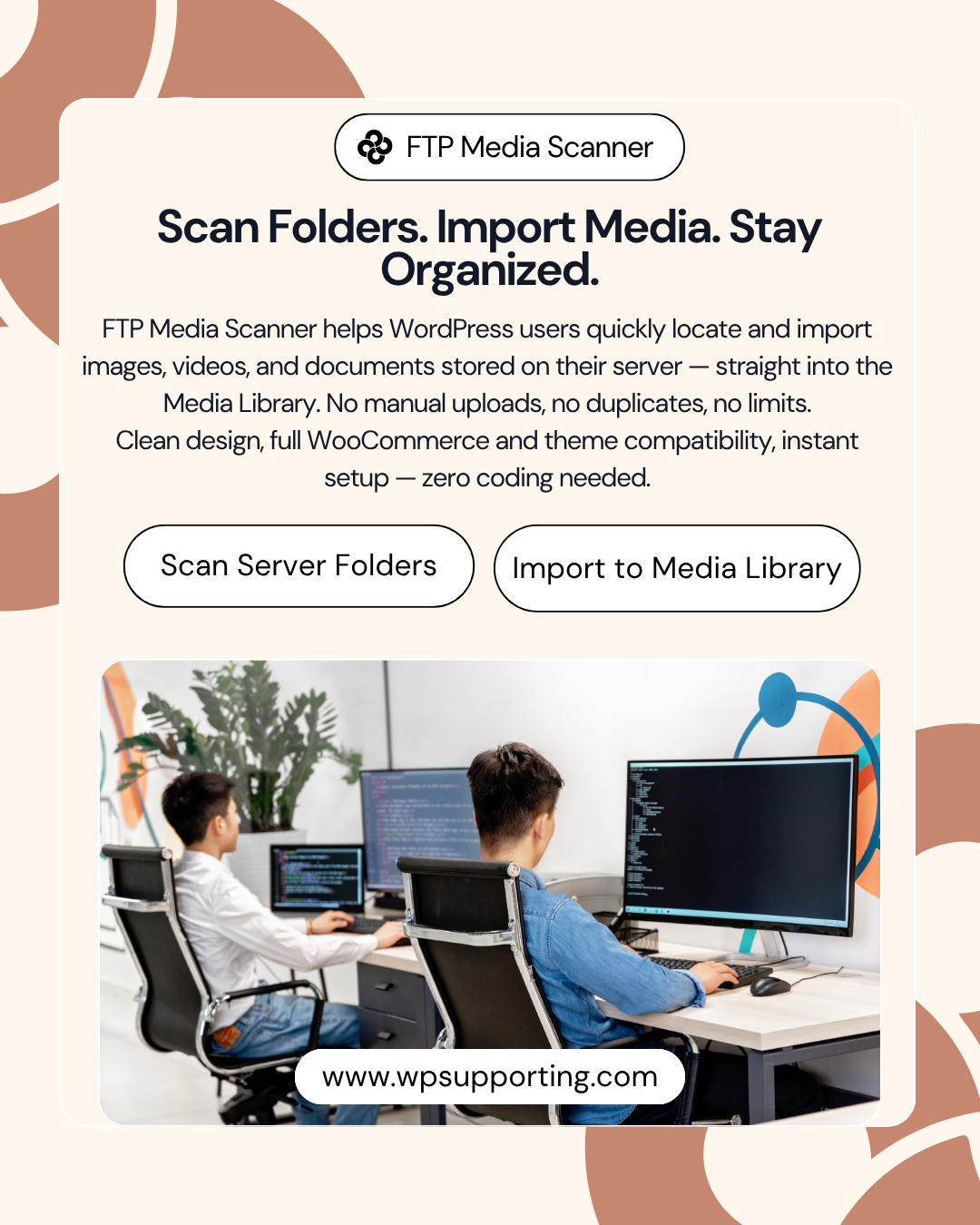 FTP Media Scanner lets you scan your server folders and import images, videos, and documents directly into your WordPress Media Library — no manual upload needed. Detect duplicates, auto-generate thumbnails, and organize your files in seconds.